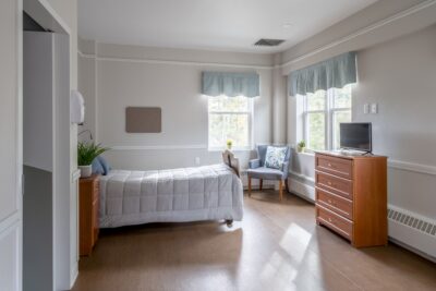 The comprehensive building renovation revitalized three residential wings—featuring private rooms, activity and dining areas, nurses’ stations, shower rooms and occupational therapy spaces—while also upgrading the facility’s key community areas. These include the main chapel, library, beauty parlor, dining and activity rooms, memory care courtyard, offices and essential back-of-house operations such as kitchen and laundry facilities. In total, 70 resident rooms were refreshed, primarily two-bed units along with several single specialty care rooms.