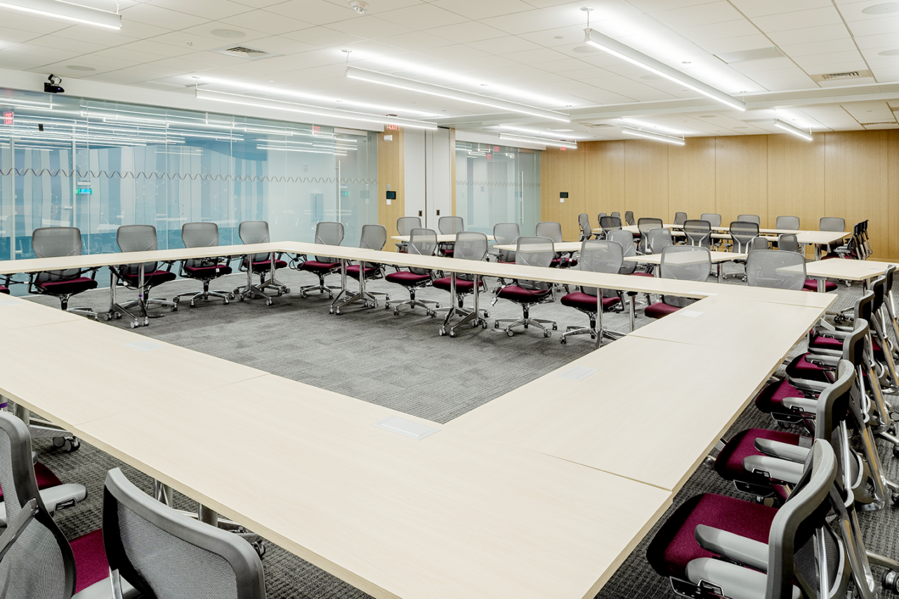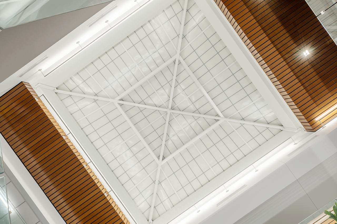 Sarepta Therapeutics, a commercial-stage biopharmaceutical company, recently expanded their headquarters in Cambridge by acquiring two additional floors. Timberline Construction successfully completed a 58,000 square foot logistically complex renovation on the 3rd and 4th floor. The project features a three-tier waterfall feature into a 20-foot pond, a visually stunning green wall, two 26-foot by 26-foot sky lights, and an interconnecting monumental staircase between the two floors. This space also includes open concept office areas, conference space, huddle rooms, a catering and servery area, and café. The 3rd and 4th floor now boasts 12,000 square feet of conference space containing three planar video walls (6.5 feet x 16.5 feet) with two Modern Fold partitions and Pulp switch glass.
