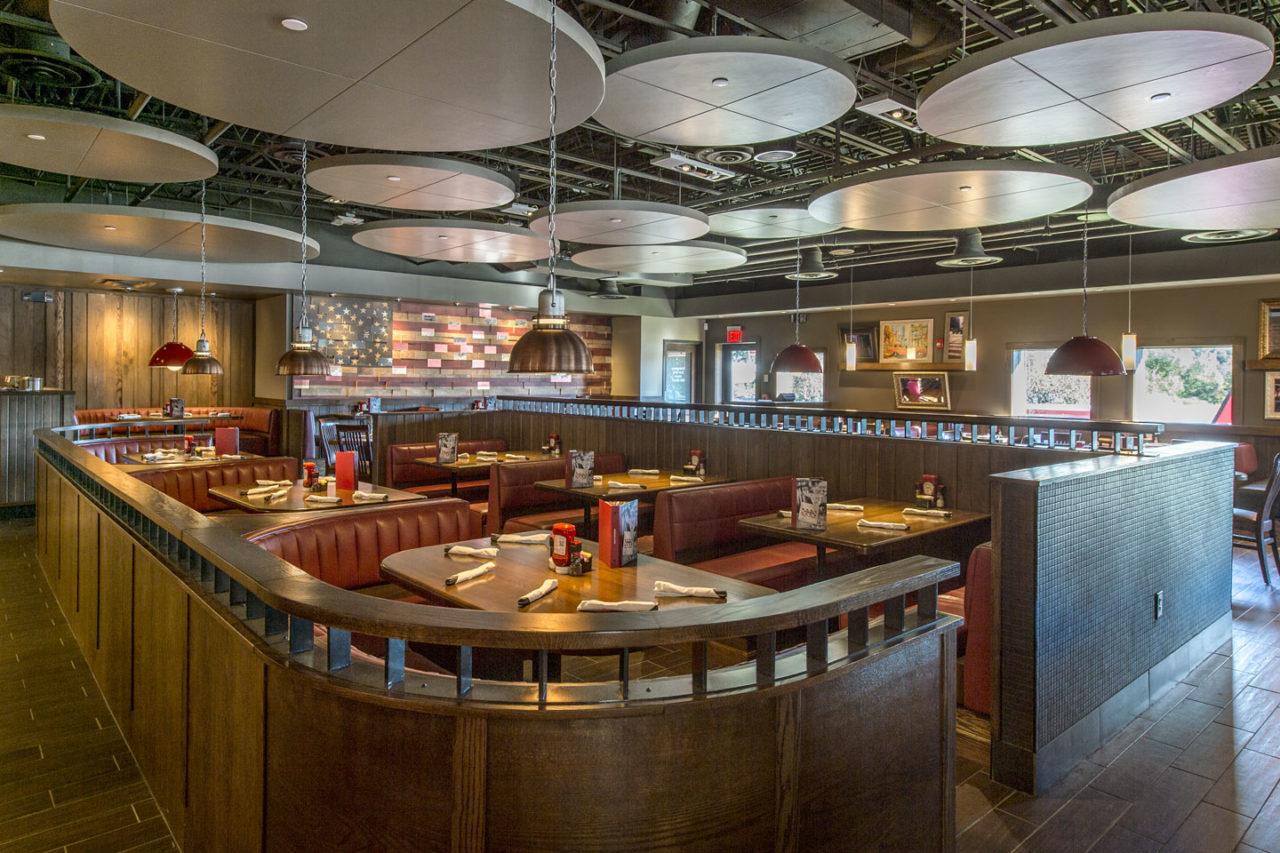 TGI Friday’s branded red color scheme and sporty flare is represented throughout. Exposed ceilings, unique lighting fixtures and creative detailing infuse the space with a modern industrial feel.