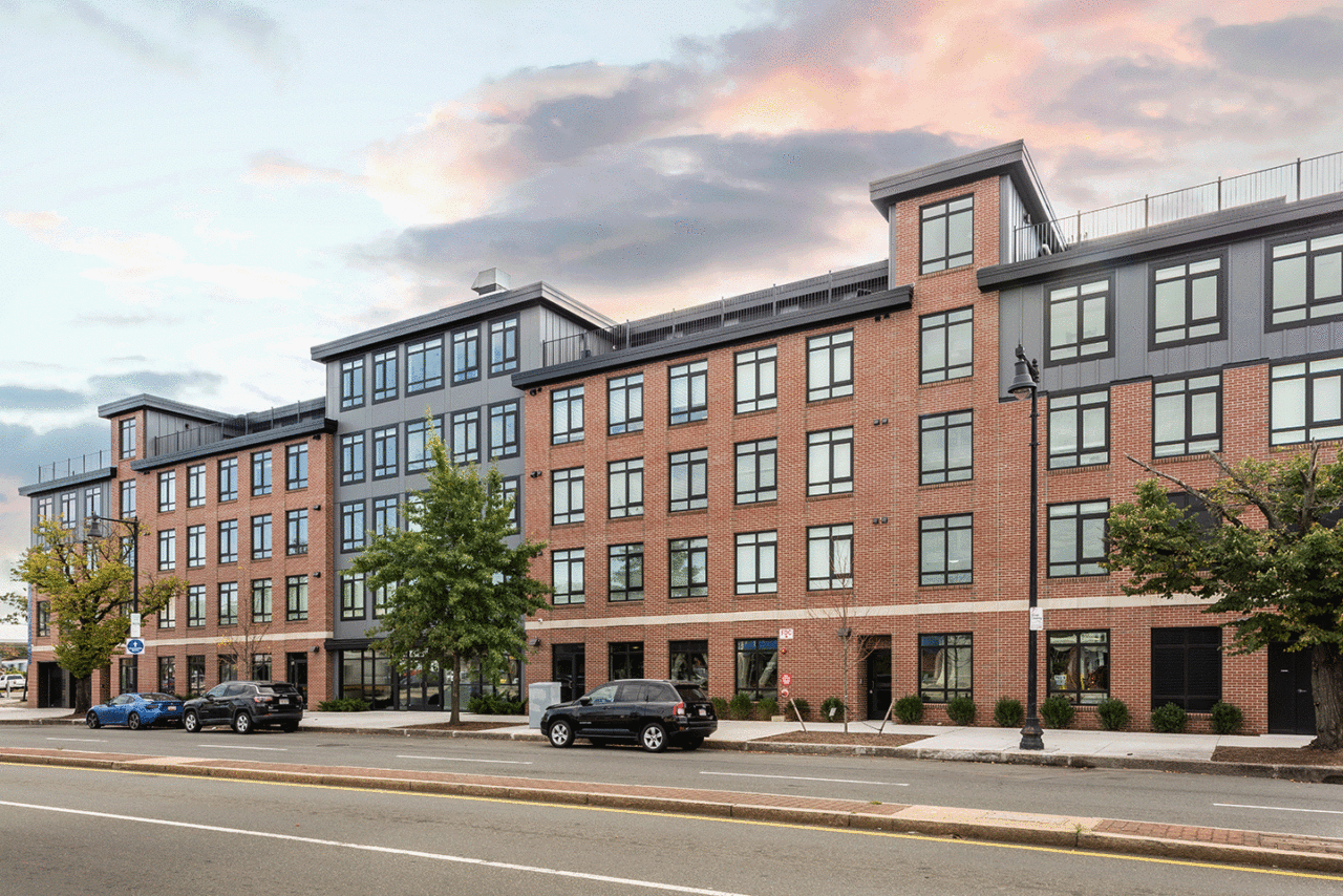 In addition to private outdoor space, the building provides a shared roof deck, bike storage, ground-level parking for 32 cars and is conveniently located next to the Orient Heights MBTA Blue Line station. Because The Bennington backs up to the train tracks, the entire rear of the building is outfitted with reduced sound transmission glass and double-layer wall insulation to deaden sound.